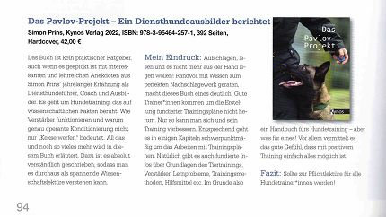 "Dazu unser Buchtipp „Das Pavlov-Projekt – Ein Diensthundeausbilder berichtet“ – viele Menschen, die sich mit dem Training von Hunden beschäftigen, sprechen gar vom besten Buch der vergangenen Jahre."
