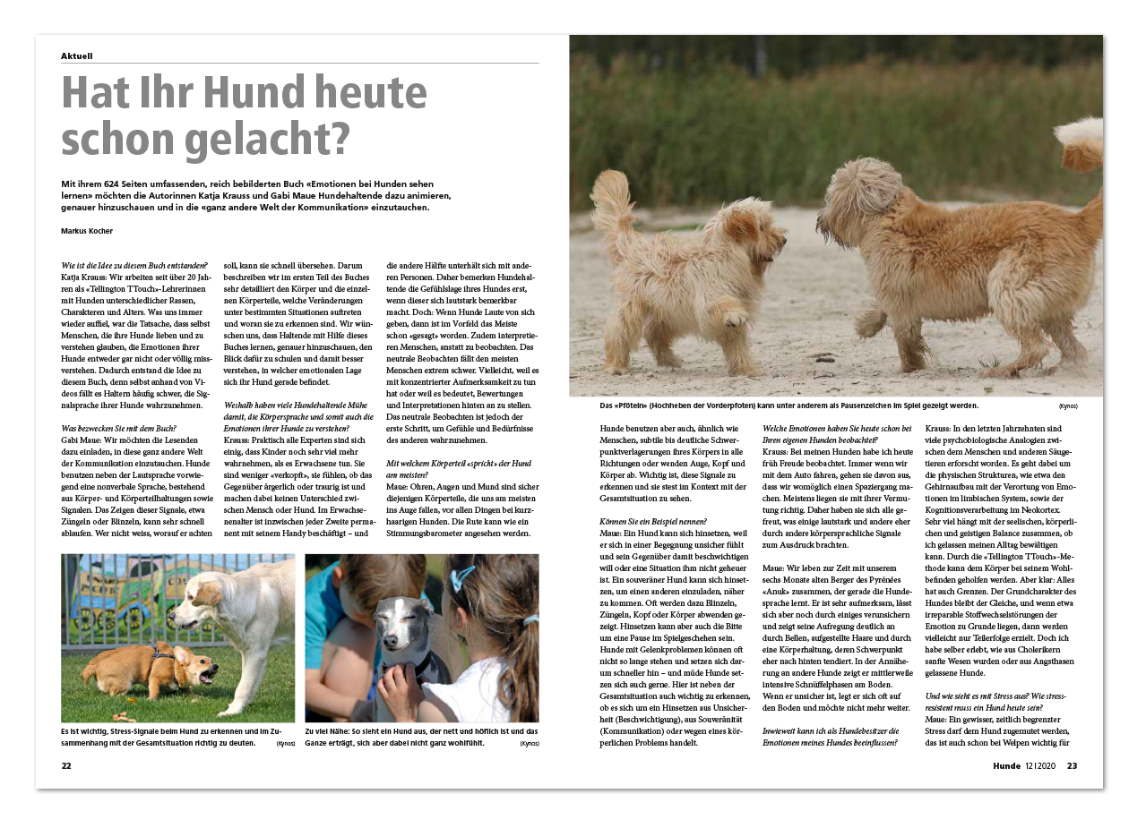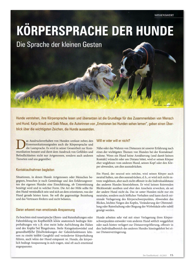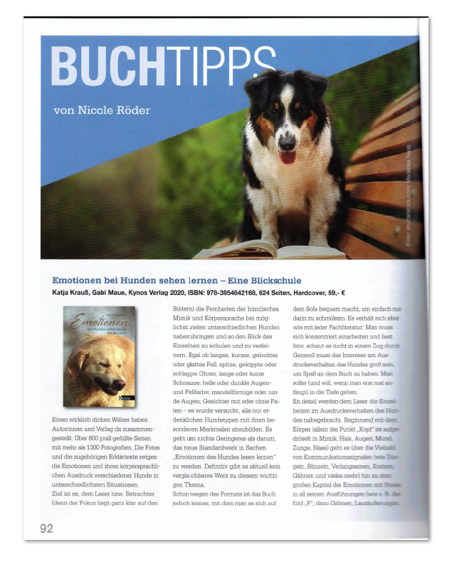 "Das Buch liefert einen unerschöpflichen Fundus an Fotos und Beschreibungen, mit deren Hilfe man seinen Blick schulen kann, um dann an den eigenen oder fremden Hunden das Gelernte weiter zu vertiefen. Die Lektüre macht Freude, da der mit seinen über 600 Seiten doch sehr gewichtige Band nicht mit langen Texten überfrachtet ist, sondern gezielt die Körpersprache der abgebildeten Hunde für den noch ungeübten Leser dechiffriert. Es gibt hier unglaublich viel in der Körpersprache und Gefühlswelt der Hunde zu entdecken und die Autorinnen schöpfen aus einem riesigen Bild- und Erfahrungsfundus. Eins ist gewiss: Am Ende spannender Stunden der Lektüre wird der Leser Hunde und deren Emotionen mit anderen – schärferen – Augen sehen."